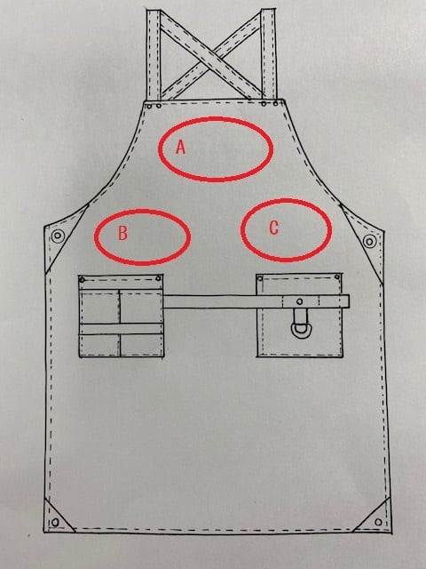 ベース料金は縦5センチ×横12cmで【版代¥4000~】【刺繍代¥1500/枚~】が目安となりますがデザイン(針数)や大きさの変更により料金がかわりますので詳しくはメールでのやり取りとさせて頂きます。刺繍位置は参考画像のA B Cのいずれかの場所になります